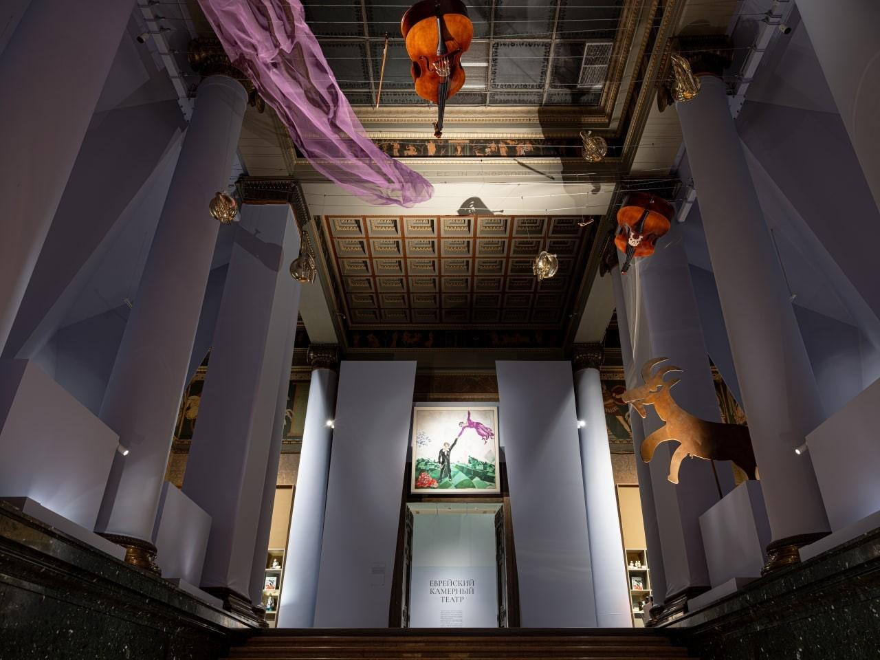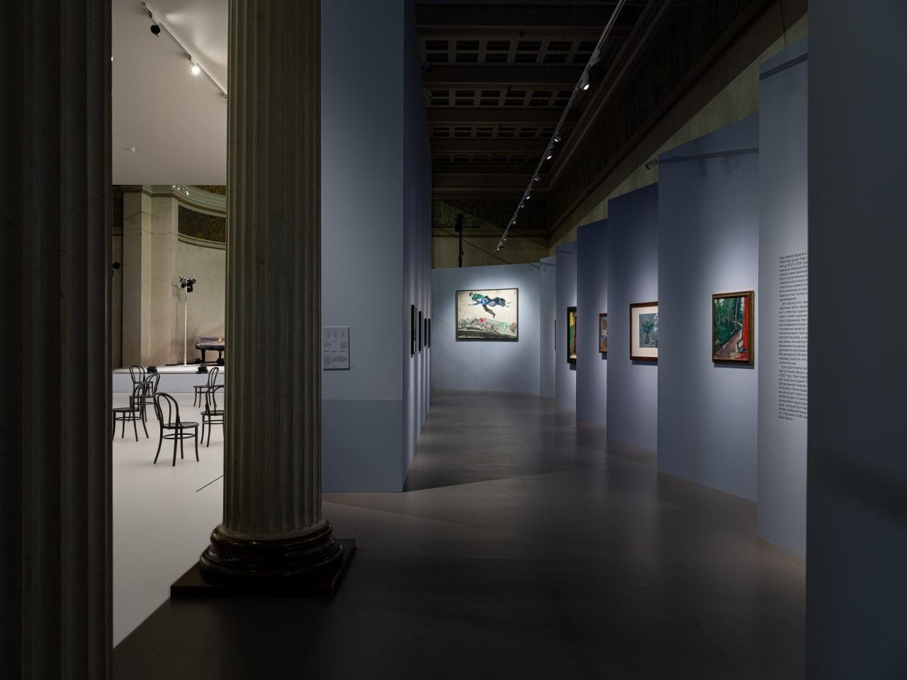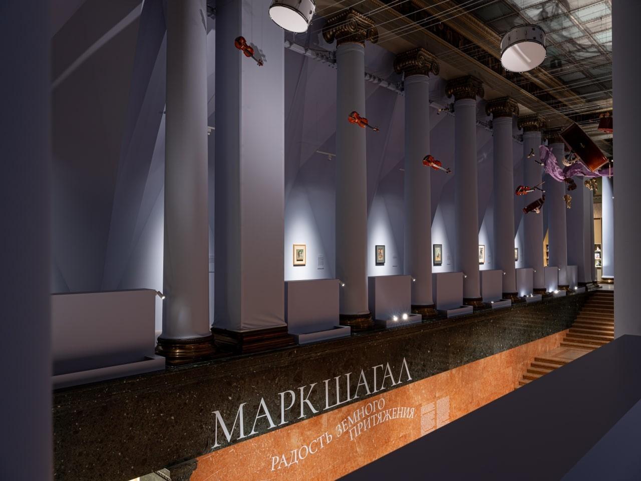 Центром экспозиции в Белом зале музея явлется реконструкция зрительного зала Еврейского камерного театра, для которого художник в 1920 году расписал девять панно (сохранились семь). Здесь же посетители могут ознакомиться с письмом Шагала в дирекцию Еврейского театра с просьбой дать возможность увидеть его работу не только публике, посещающей спектакли, но и всем желающим. На выставке также представлены произведения из так называемой «витебской серии», в которой Шагал с огромной любовью и вниманием запечатлел самых близких людей и виды родного города и его окрестностей. Почувствовать атмосферу, любимую мастером, позволяет инсталляция «Комната семьи Шагал» - воссозданный интерьер с подлинными предметами мебели из дома художника в Витебске. Эти экспонаты демонстрировались в России лишь однажды. Также экспозиция включает работы, которые никогда прежде не выставлялись или десятилетиями не покидали запасники музеев. Впервые в таком объеме будет представлен цикл рисунков, посвященных Первой мировой войне, - свидетельство того, как чутко художник реагировал на суровую реальность, окружившую его «сказочный» Витебск в военные годы. Кроме того, посетители увидят оригинальные иллюстрации Шагала к сказкам Дер Нистера (настоящее имя - Пинхас Каганович), саму детскую книгу, которая была опубликована только один раз - в 1917 году - на идише. Из собрания Пушкинского музея будут представлены иллюстрации Марка Шагала к поэме Николая Гоголя «Мёртвые души», которые были созданы в 1923–1926 годах, уже после окончательного отъезда художника из России. Скучая по родине, Шагал продолжал писать произведения, связанные с его жизнью в России.